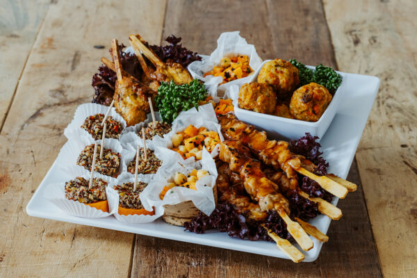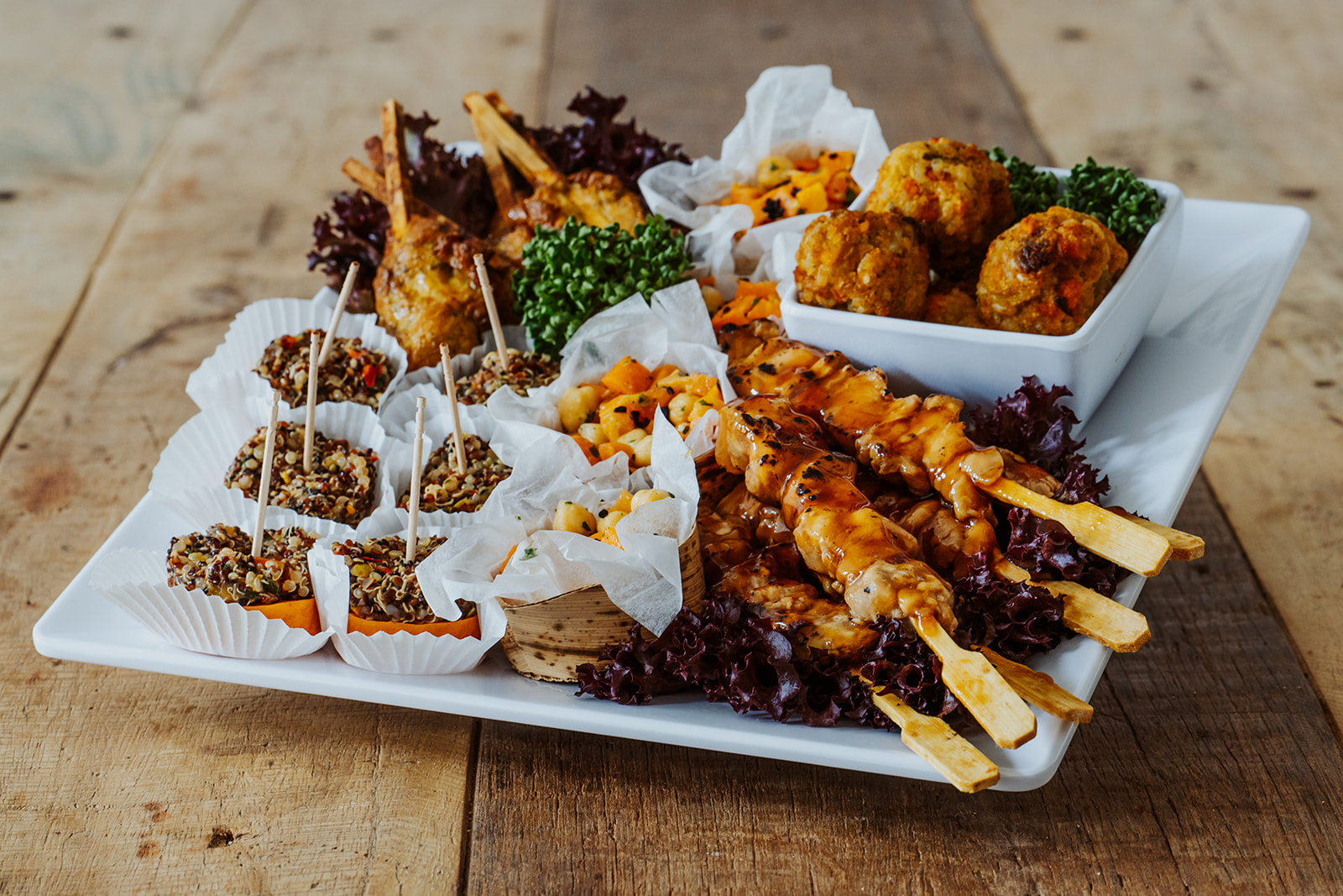 4 x Hummus mit Karotten-Kichererbsen-Salat im Palmblatt; 6x marinierte Green Chicken-Sticks; 6x Gemüsereisbällchen „Asia“; 6 x kleine Törtchen Quinoa auf Gazpachocreme; 6 x Hähnchenspieß Yakitori.