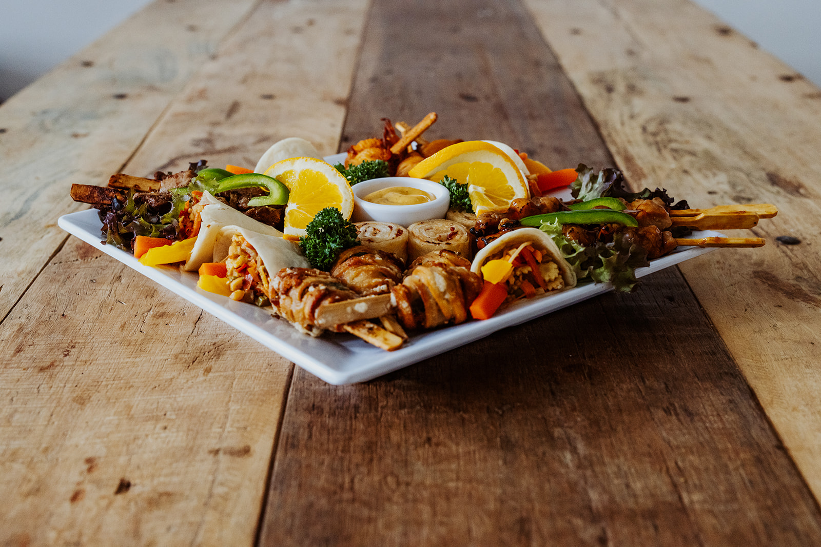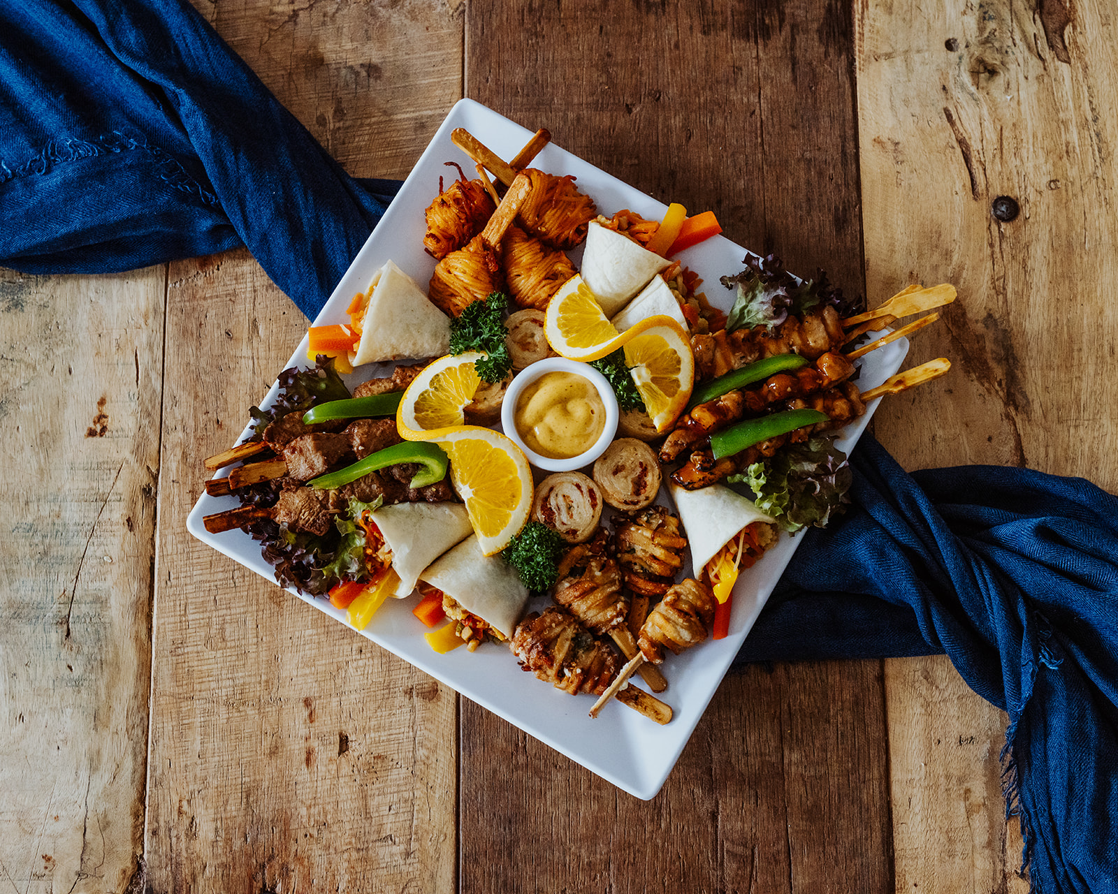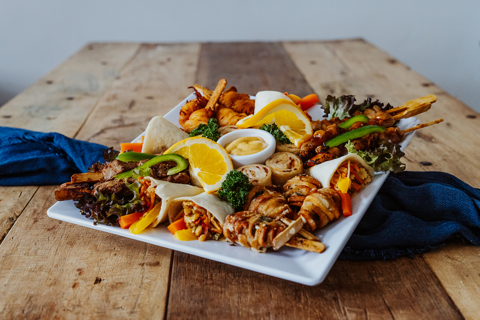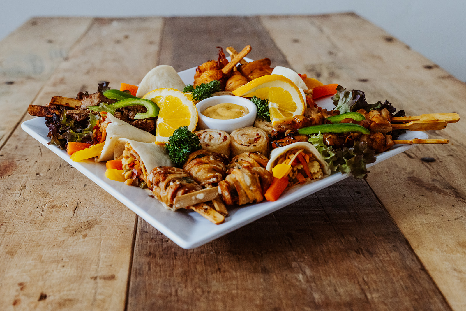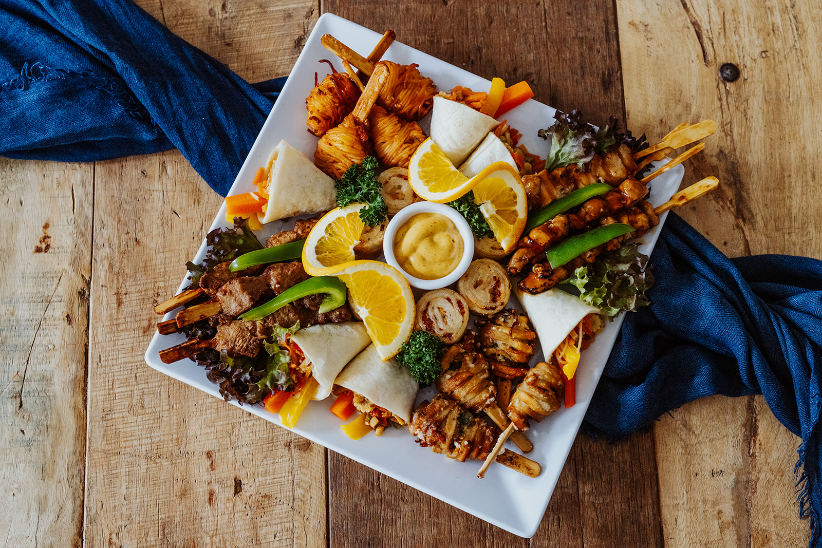 6 Mini-Wraps „Asia“, 4 kleine Saté-Spieße, 6 gefüllte Tortilla-Flammkuchen, 4 Hähnchenspieße mit Ananas, 4 Noodle-Sticks Teriyaki, 4 Noodle-Sticks „Sweet & Sour“, dazu Thai-Mango-Sauce.