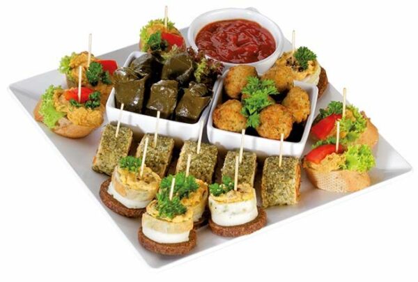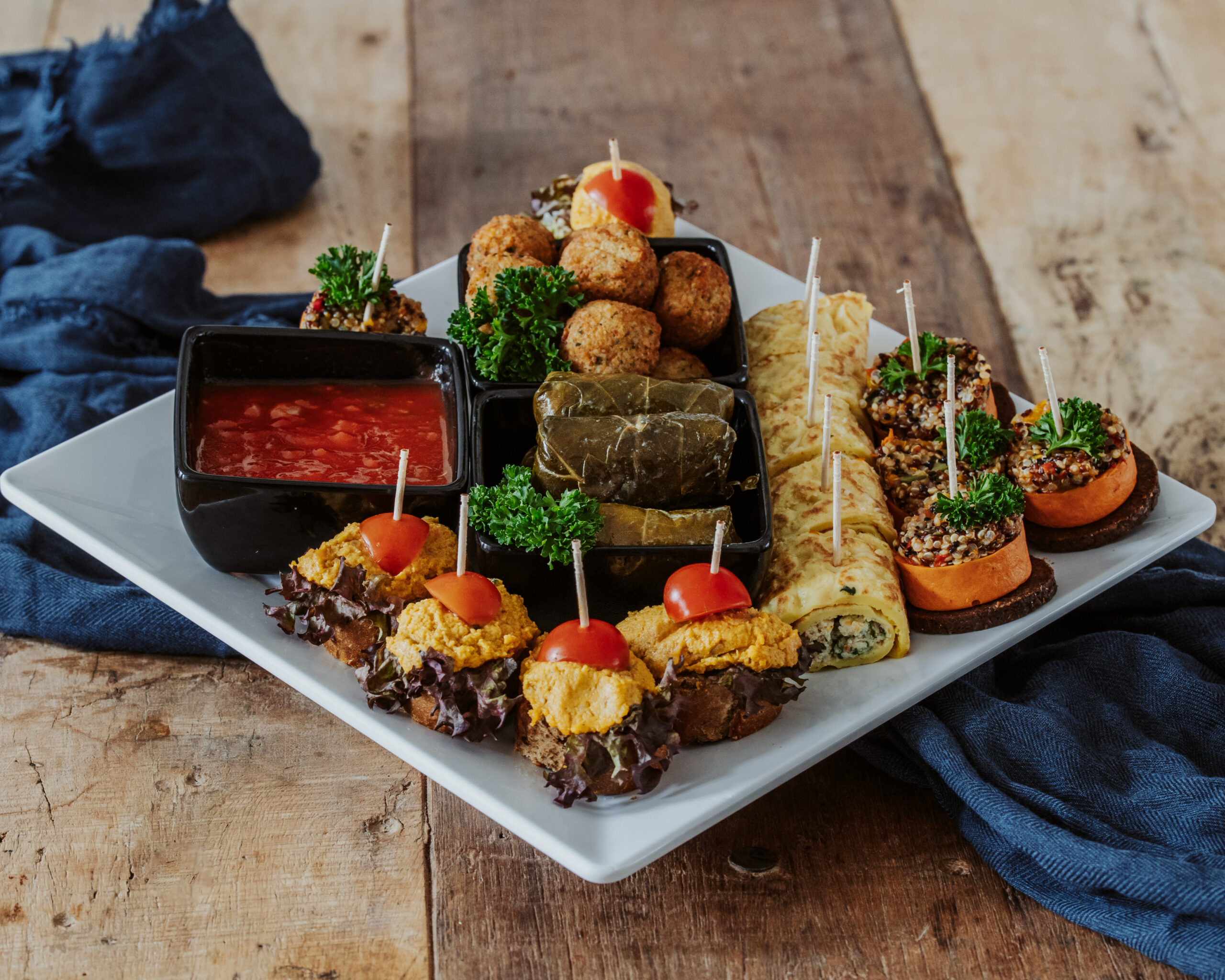 5 gefüllte Weinblätter mit Reissalat, 10 kleine Falafelbällchen, 5 Törtchen Blumenkohl-Couscous auf Vollkornround, 5 kleine Canapés mit Hummus „oriental“, 5 x vegane Crêperolle „mediterran“ mit Gemüsefüllung im Kürbiskernmantel, pikante Tomatensalsa.