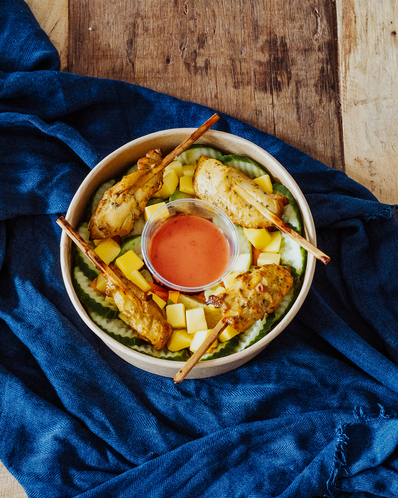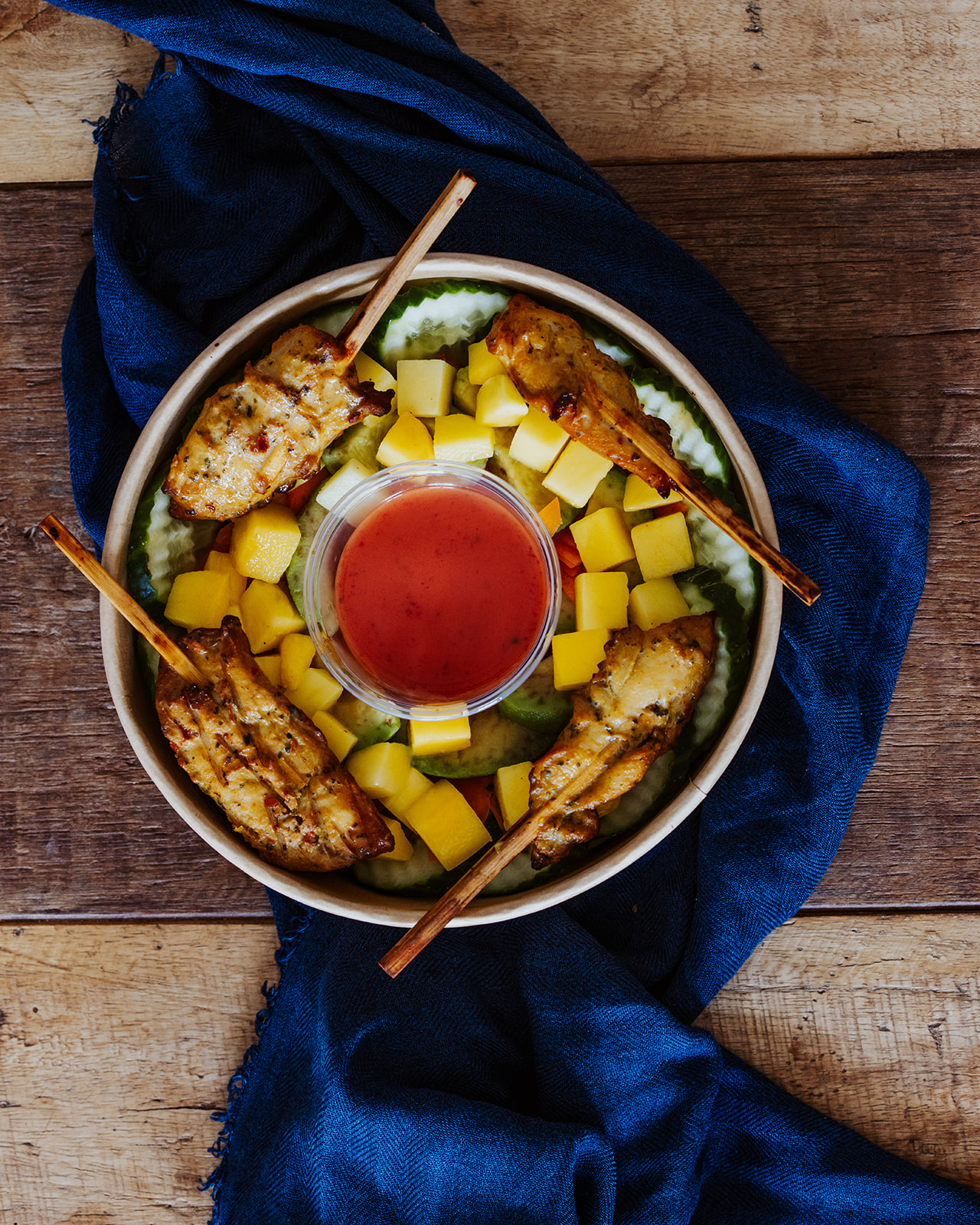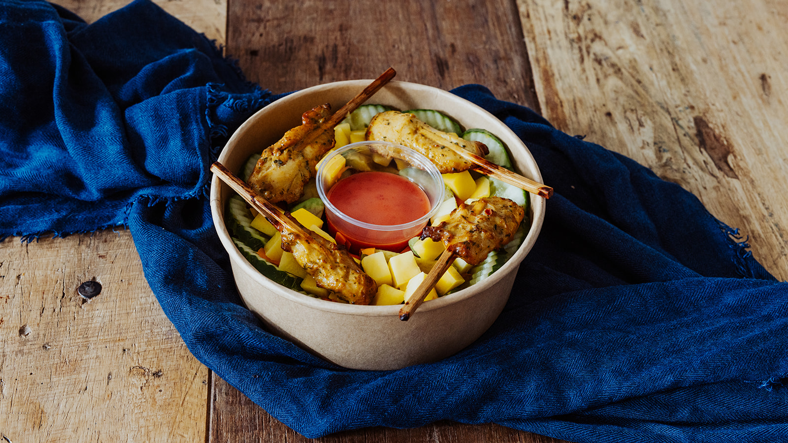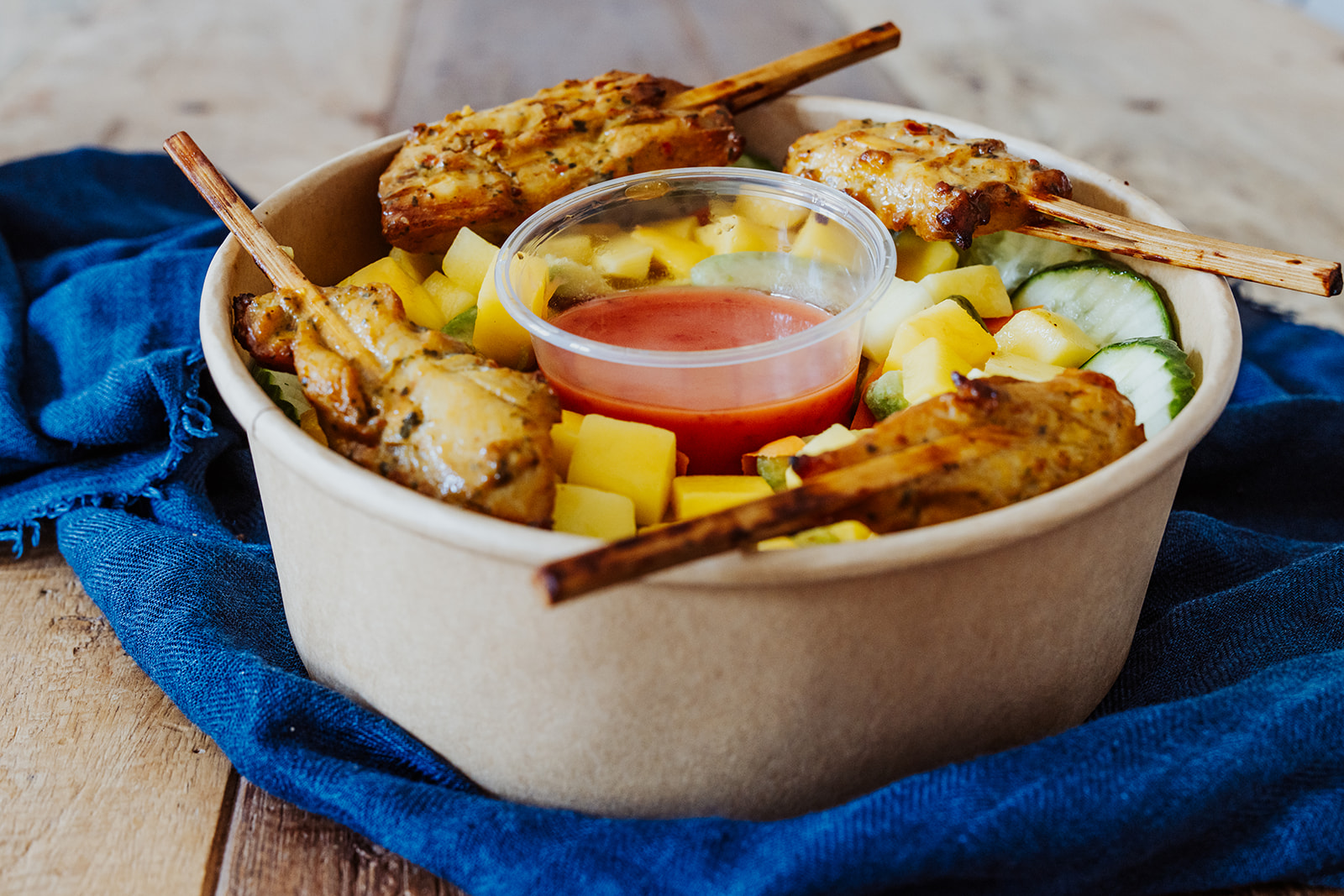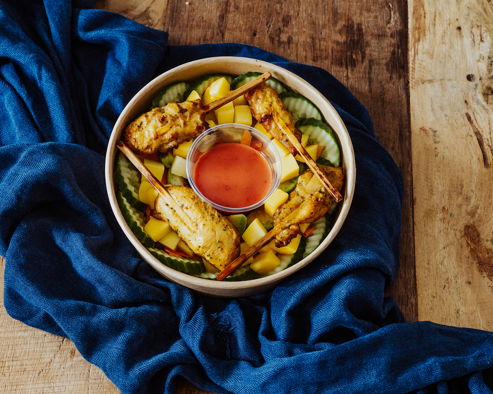 Basmatireis mit Avocado, Mango, Gurke und Karotte, gekrönt von 4 Green Chicken-Sticks.