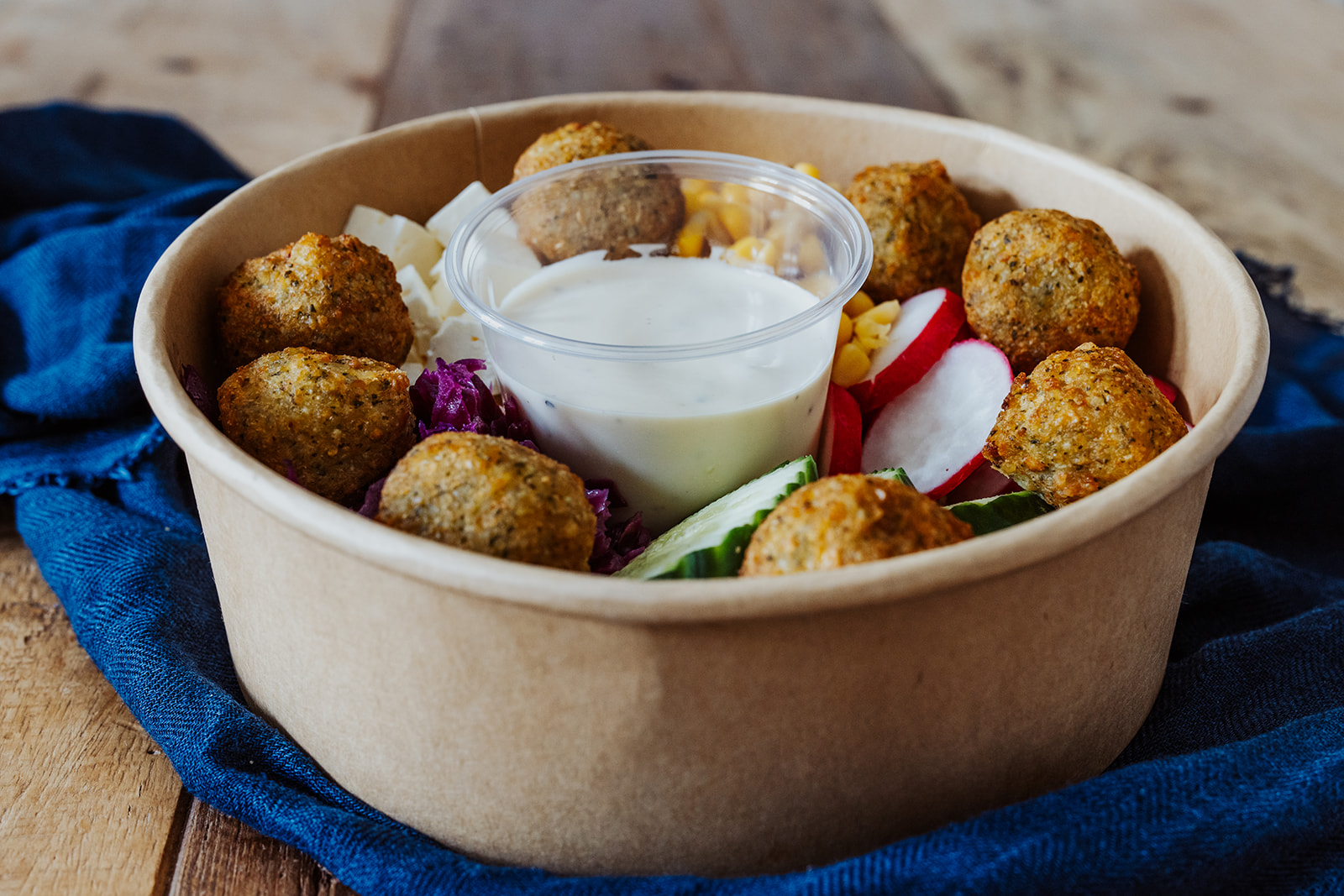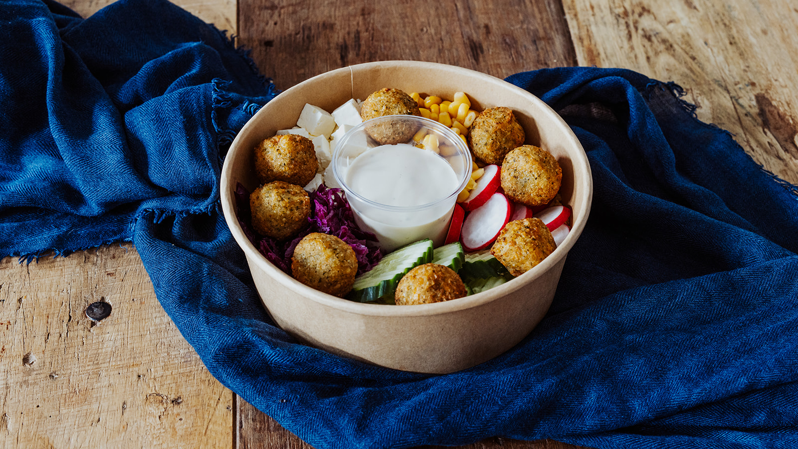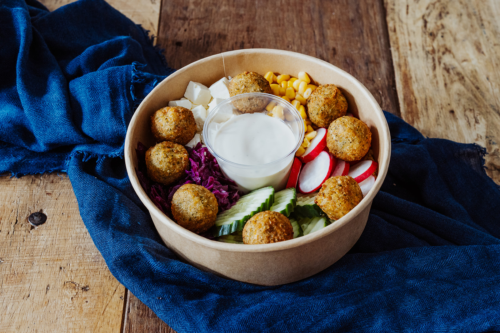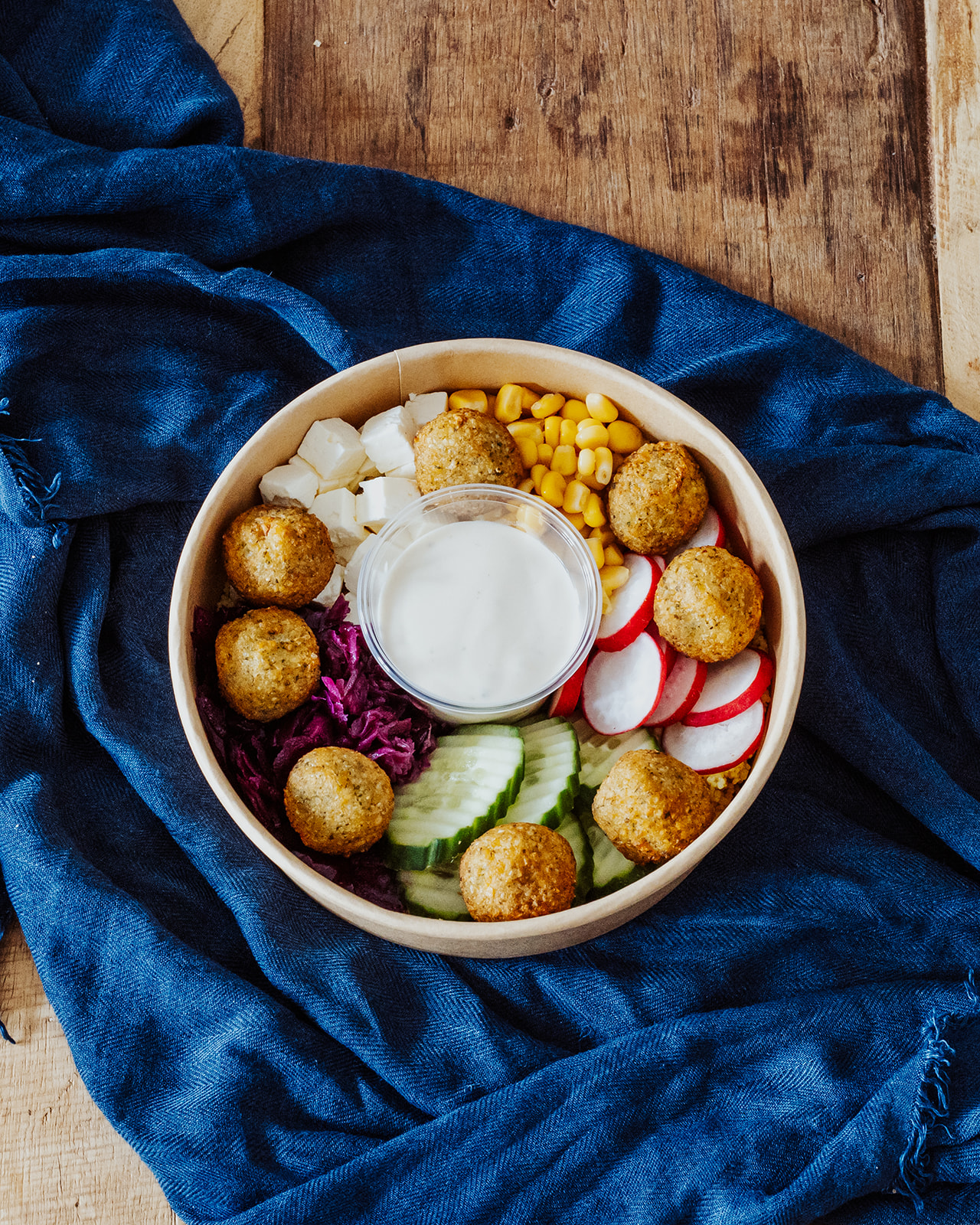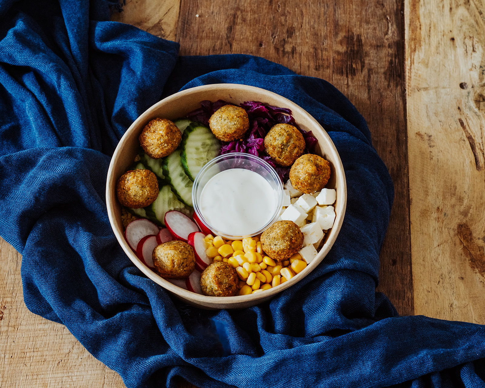 Feta-Käse, Rotkraut, Mais, Gurke und Radieschen auf körnigem CousCous, darauf 8 Falafelbällchen.