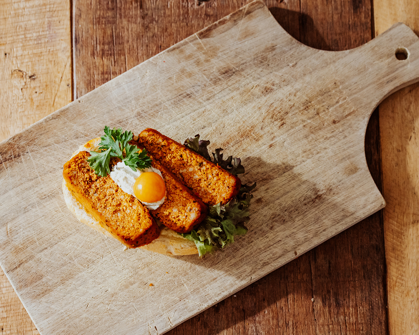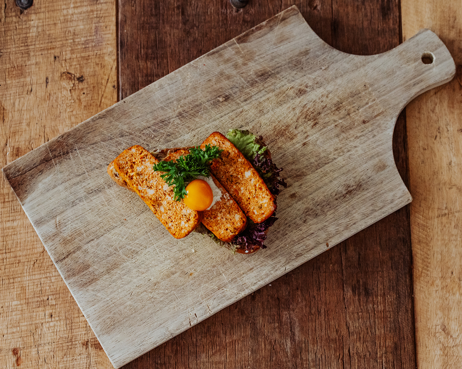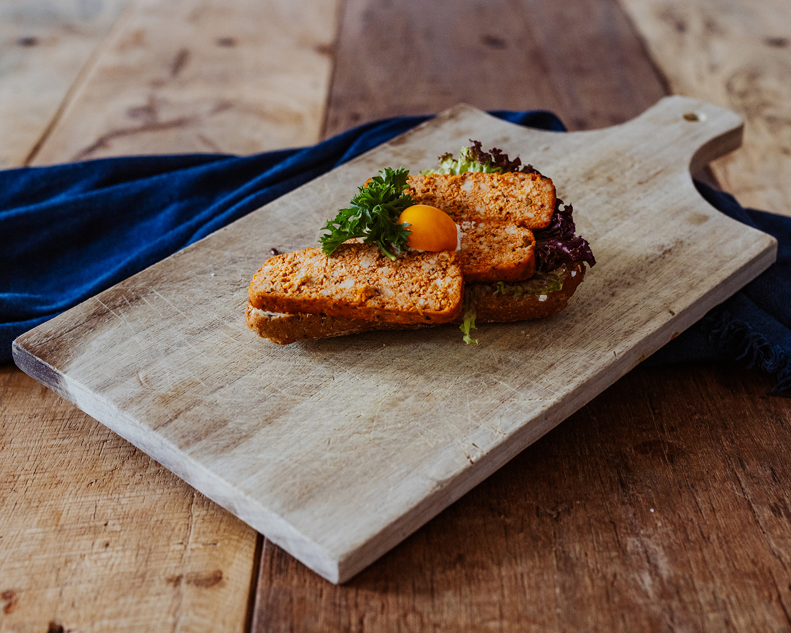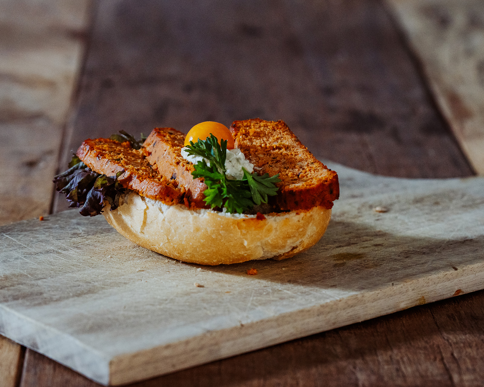 Halbe belegte Brötchen mit Tofu rosso mediterran, vegan