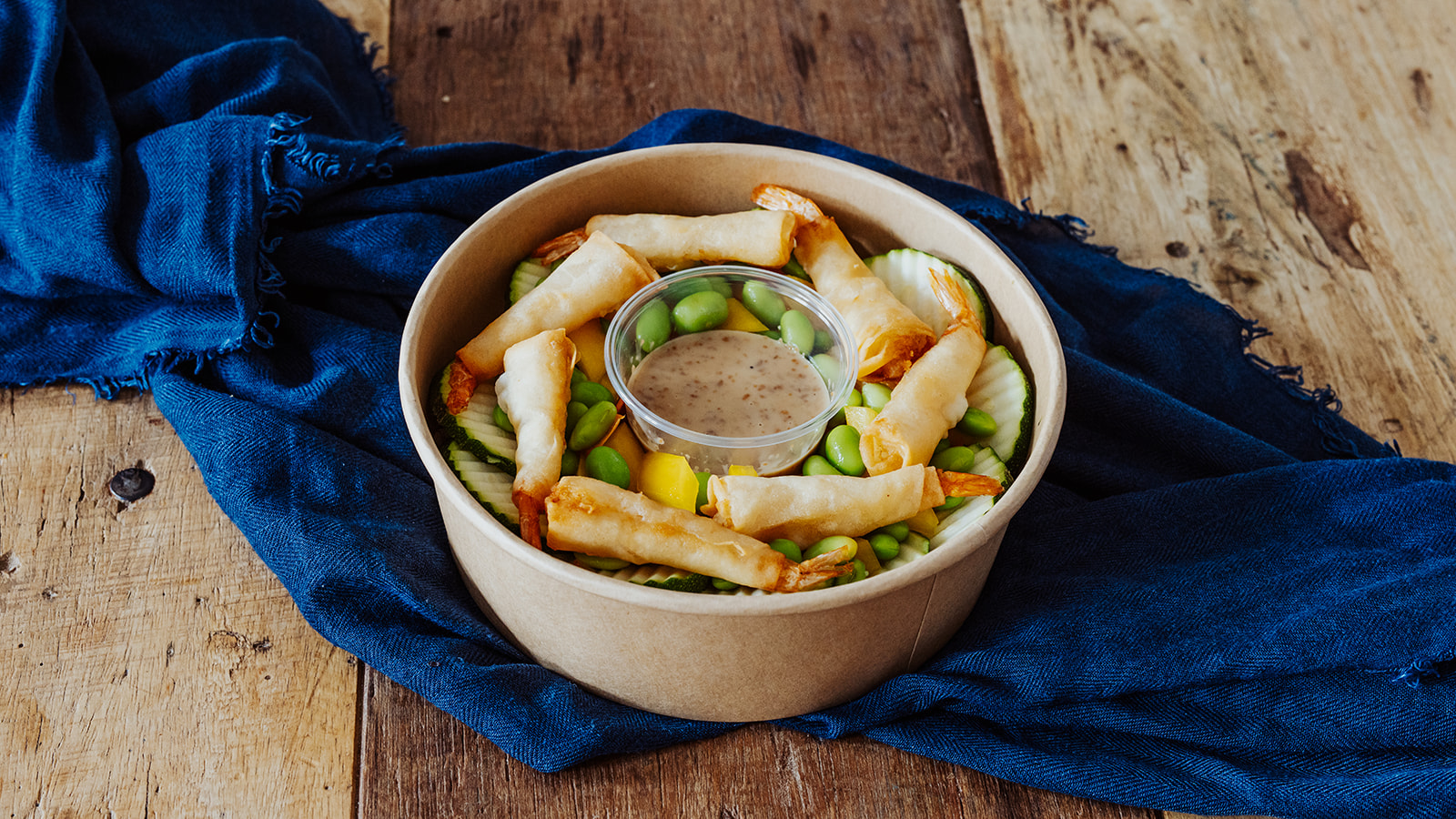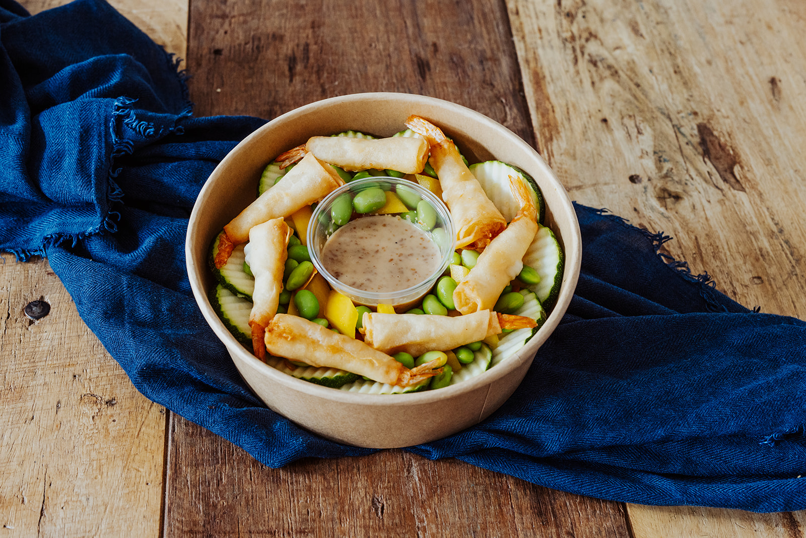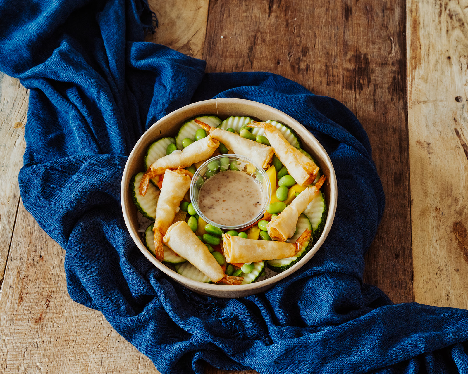 dazu 7 Garnelen im Backteig und Goma-Dressing.